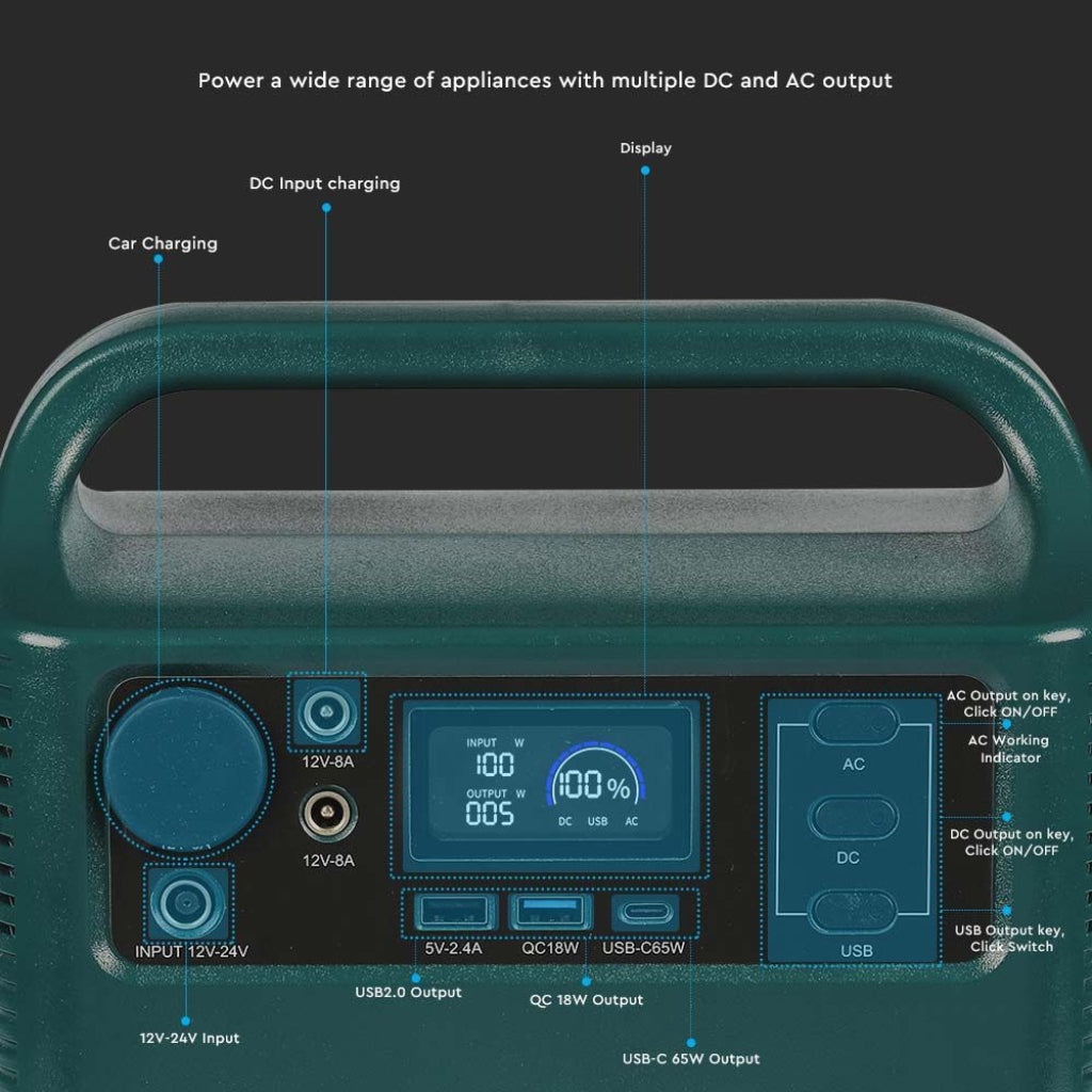 Prenosna elektrarna z baterijo za shranjevanje LiFePO4 274 Wh je prenosna naprava, ki ponuja zanesljiv vir energije za vse vaše potrebe po energiji . Z dvema izhodoma AC po 300 W vsak in največjo izhodno močjo AC 500 W, lahko ta elektrarna napaja različne vrste elektronske opreme in gospodinjskih aparatov, vključno z: