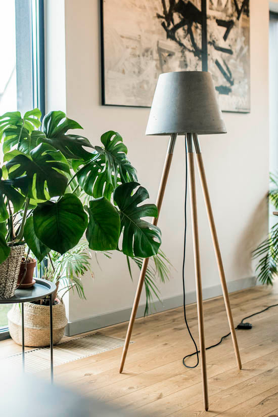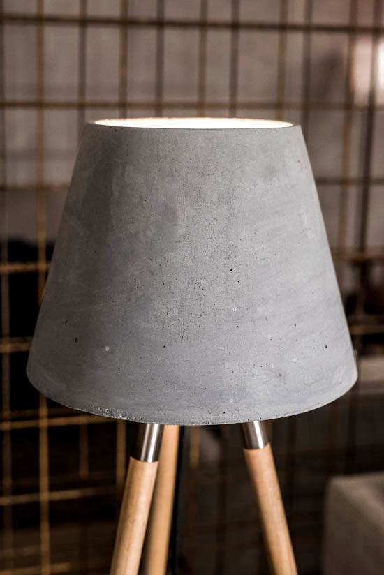 Betonska talna svetilka Kopa je narejena na osnovi nog iz jesenovega lesa in jeklene konstrukcije.