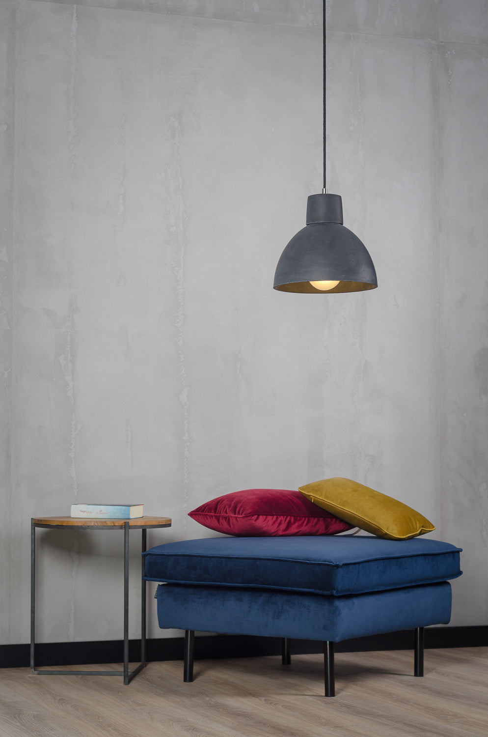 Betonska viseča svetilka iz kolekcije Korta – z dvodelnim betonskim senčnikom.